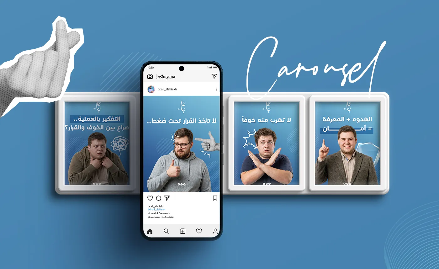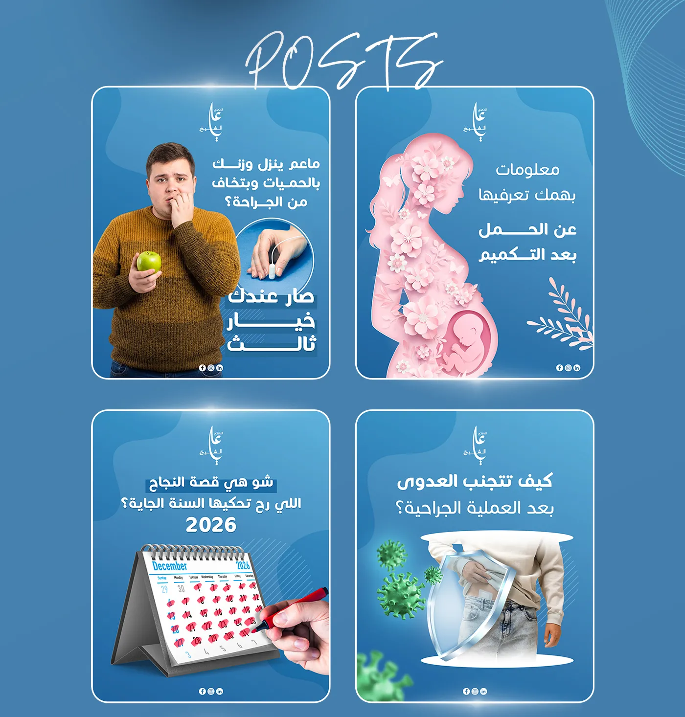 التنفيذ البصري: اخترنا مزيجاً من اللونين الأزرق النقي والأبيض لتعزيز شعور الأمان والتعقيم، مع تصميم سلسلة "ريلز" تفاعلية تكسر حاجز الخوف بين الجرّاح والمريض من خلال إجابات مباشرة وواقعية.