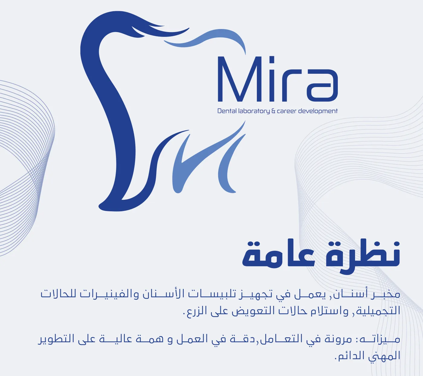 اللغة البصرية: اخترنا تدرجات الأزرق مع الأبيض النقي لإعطاء انطباع بالتعقيم والدقة المتناهية، وهي العناصر الأساسية التي يبحث عنها أطباء الأسنان في مخبر احترافي.